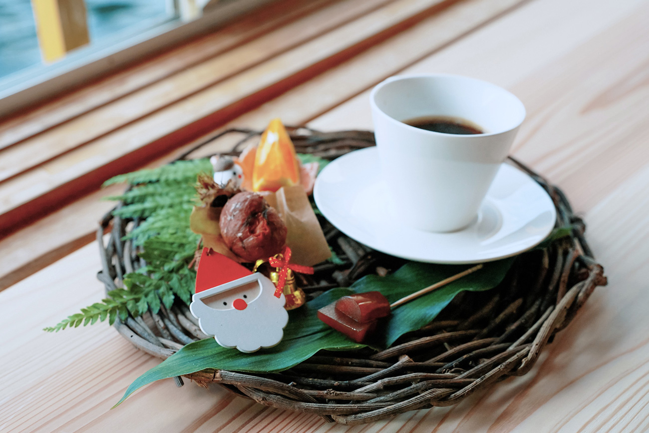 炭を使って焙煎した四万十のご当地コーヒーに、季節のスイーツを添えてご提供いたします。